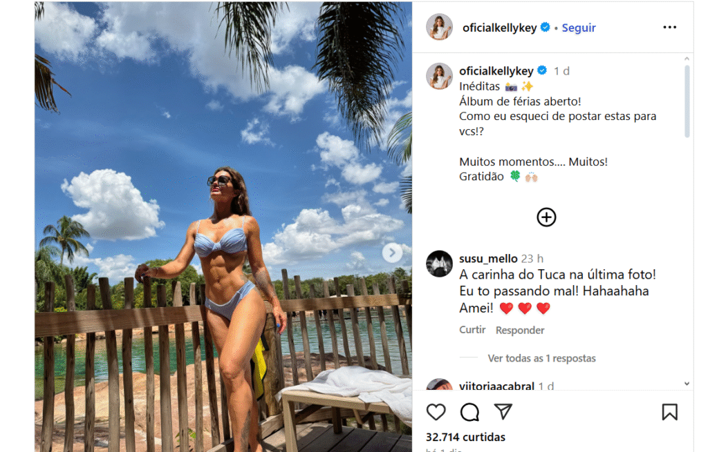 Com curvas definidas e abdômen torneado, a artista impressionou os fãs, que lotaram os comentários de elogios. Na legenda, ela escreveu: “Inéditas. Álbum de férias aberto! Como eu esqueci de postar estas para vocês!? Muitos momentos… Muitos! Gratidão”. Entre as reações, comentários como “Não dá, sério! Perfeita demais” se repetiram.
