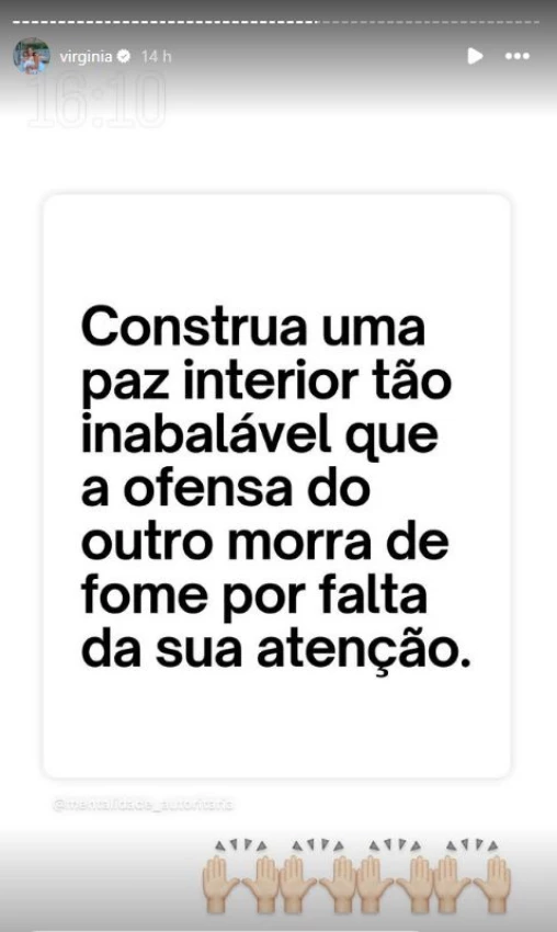 No recado, Virginia destacou a importância de não se abalar com ofensas ou atitudes alheias. A frase publicada dizia: “Construa uma paz interior tão inabalável que a ofensa do outro morra de fome por falta da sua atenção.” A mensagem foi interpretada por muitos seguidores como uma indireta após a revelação feita pela jornalista Gaby Cabrini, que noticiou o possível envolvimento do cantor.